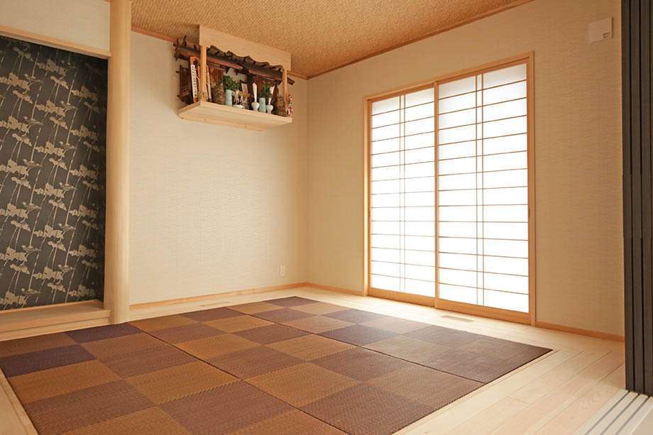 リビングの続き間は、和室となっており、ユニット式の畳を囲むようにロの字型の縁甲板(えんこういた)を配し、意匠を凝らしたつくり。こちらの縁甲板と柱にはヒノキ材が使用されており、1F全体を落ち着いた雰囲気にしてくれています。