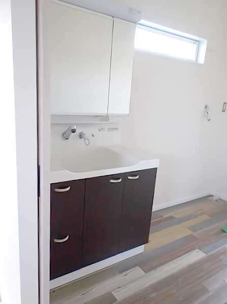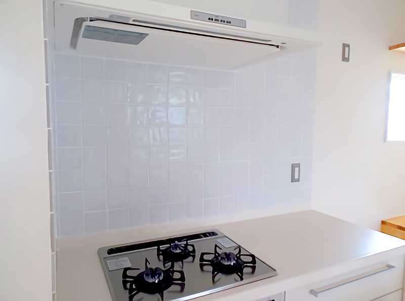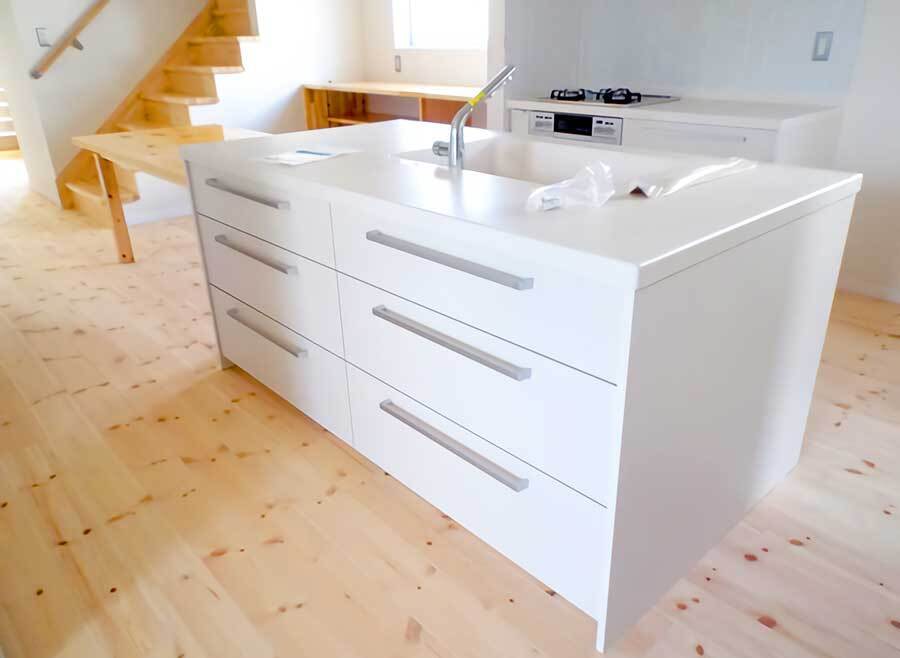 施主のN様は5人家族。一度につくる料理もたいへんなため、奥様より広いキッチンスペースのご要望をいただき、当社の提案によりセパレートキッチンを採用しました。セパレートキッチンはコンロとシンクが分かれており、シンク側のスペースに調理した料理を並べることができるため、作業効率が高く、独立したシンク台の収納力もばつぐん。