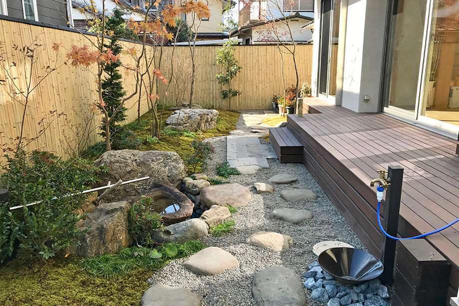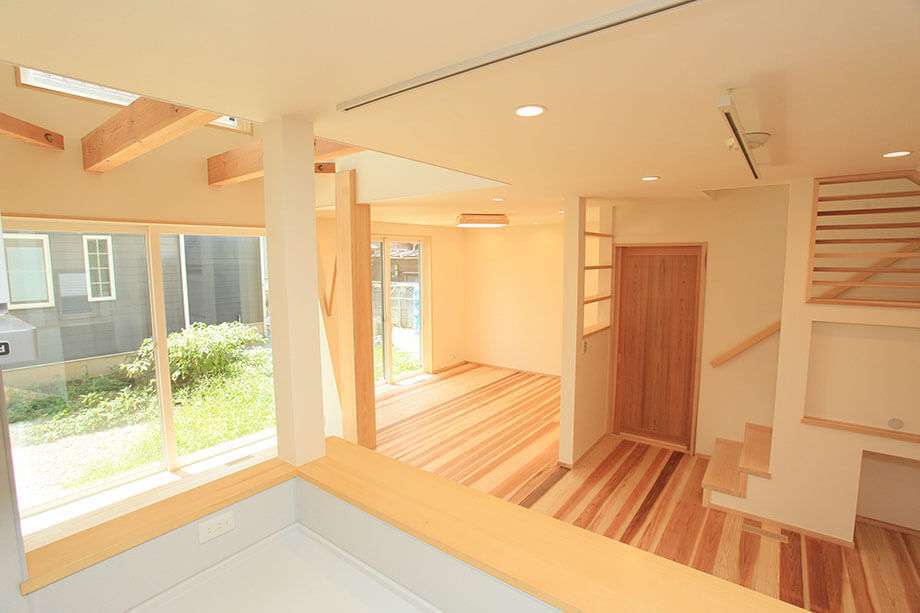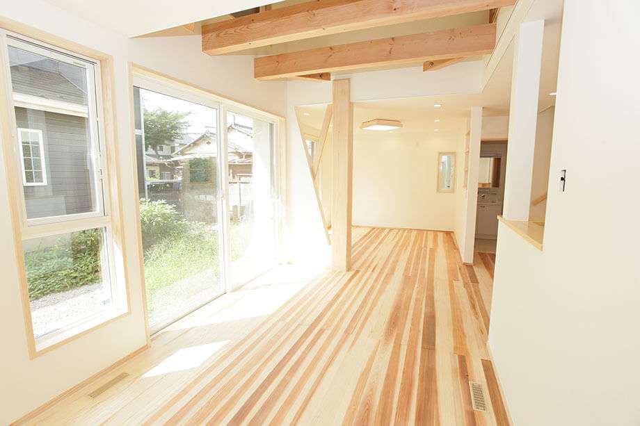 床下にエアコンの空気を送風しているため、冬は床暖房、夏は床冷房のように床の温度もエアコンの設定温度とともに、変化します。竣工後、冬の季節に、メンテナンスにお伺いした際は、施主様より、電気代は月8,000円で、以前の住居の半額というお話をお聞きしました。サッシには、断熱性に優れ結露もしにくい樹脂サッシを取り入れ、屋内の温度が外気の変化に左右されにくい工夫を施しております。また、屋外のウッドデッキも当社の施工によるもの。横幅は1.8mで、デッキ部分は7帖の広々とした空間を確保。家族全員でバーベキューも楽しむことができます。