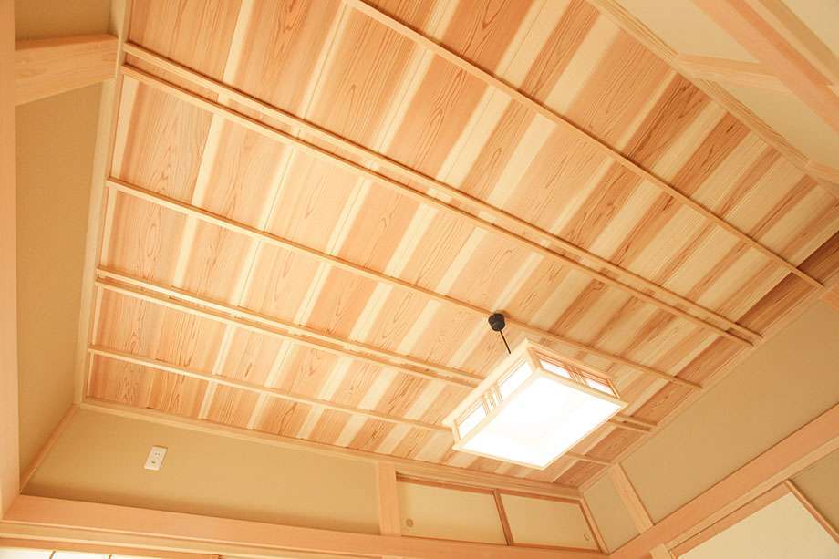 和テイストのK様邸の2つめの象徴的な空間が、1Fにある和室。昔ながらの伝統的な工法で、竿縁天井(さおぶち)を採用しております。高い技術が必要とされるため、伝統的な和室を施工できる工務店は、数が少なくなってきておりますが、熟練大工が在籍する当社では、問題ありません。部材となる木のクセを見極め、もっとも木目が映える組み方で竿天井を施工いたしました。