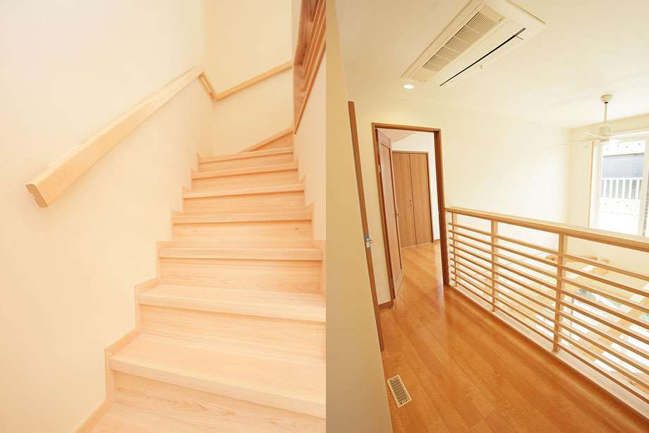 また、こちらの和室以外にも、家内のいたるとこに、無垢材のテイストを取り入れたつくり。大黒柱の横にある筋交い(まつ材)は、壁で覆わず、あえて見せる形に、階段にはヒノキの段板。2階手すりや防木には、無垢の杉材を使用。施主様が希望された「和テイスト」を無垢材によるやさしさで身近に感じることができる雰囲気を心がけました。
